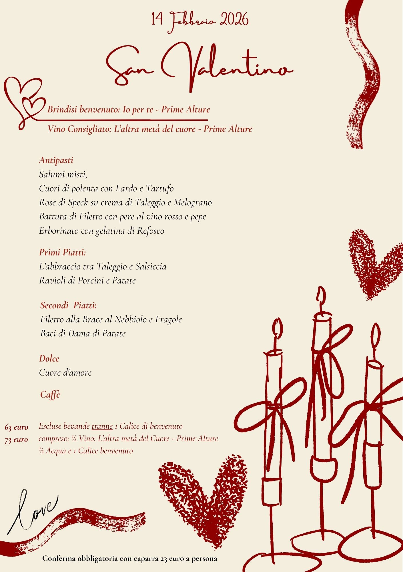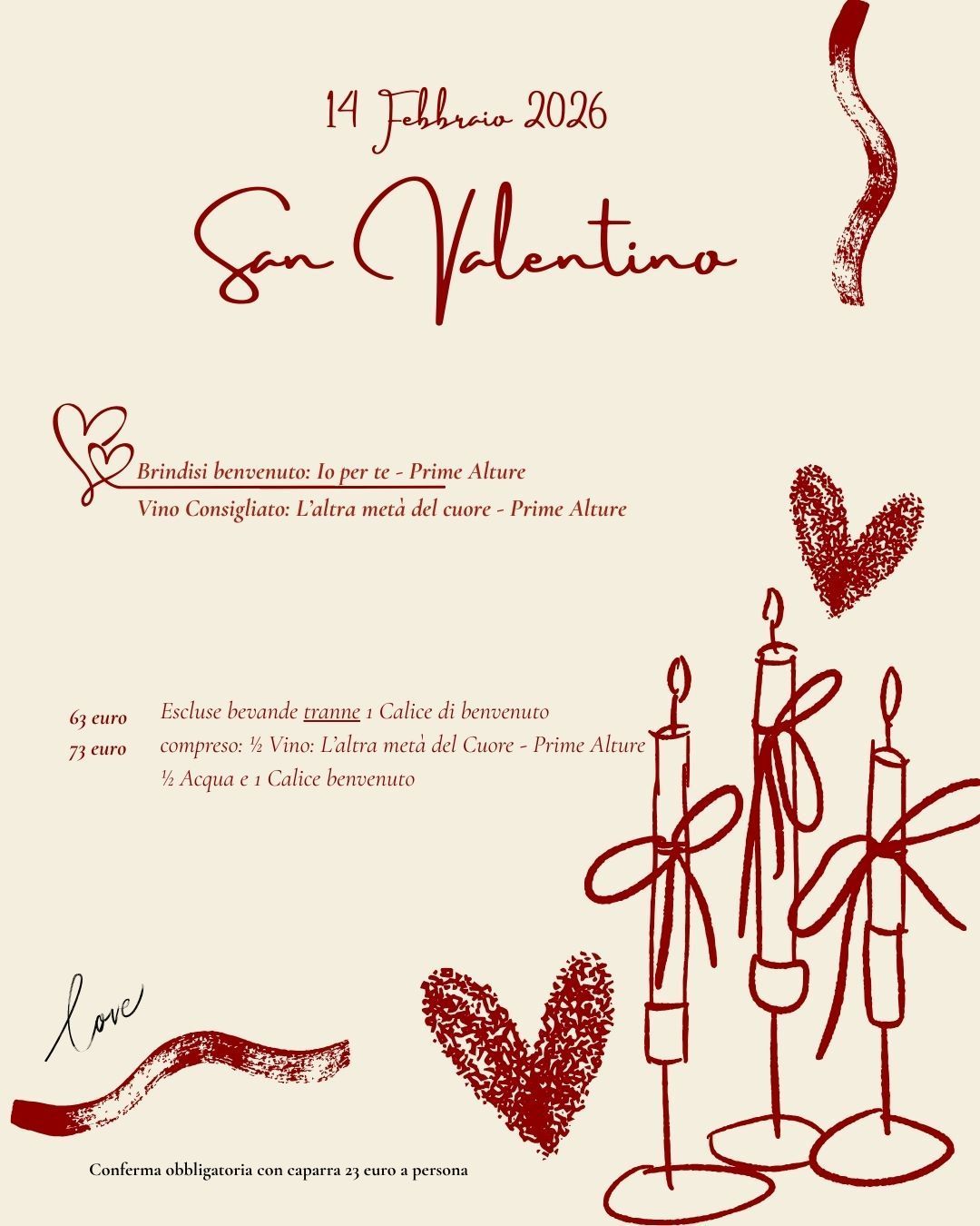 Un menu dedicato al giorno più romantico dell'anno per trascorrre una serata a lume di candela, con piatti dal sapore afrodisiaco e vini che sapranno conquistarvi.