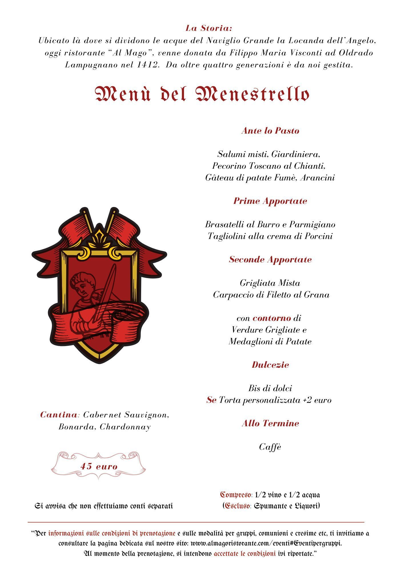 - Per avere la sala taverna riservata si richiedono almeno 45 coperti adulti paganti.