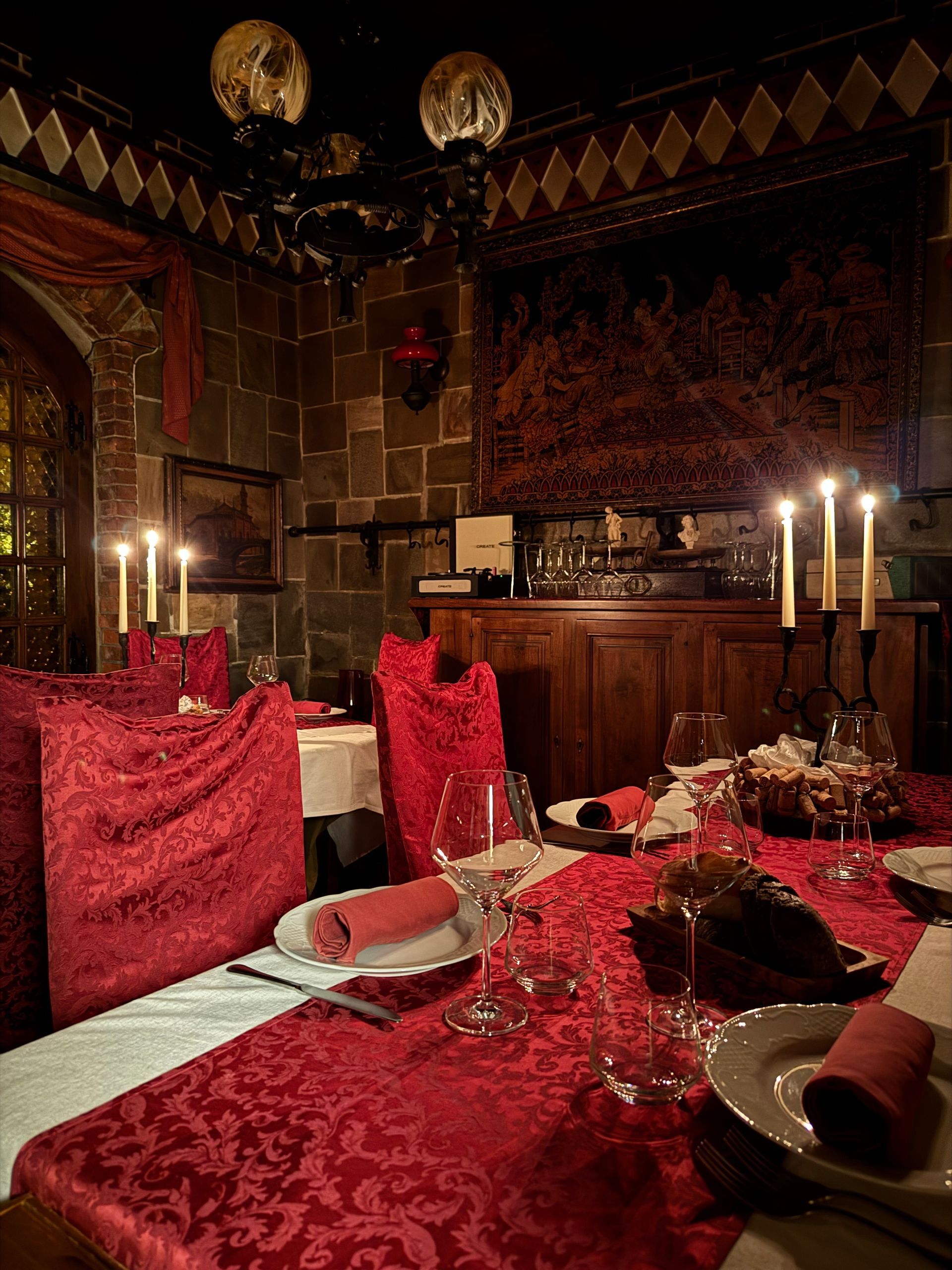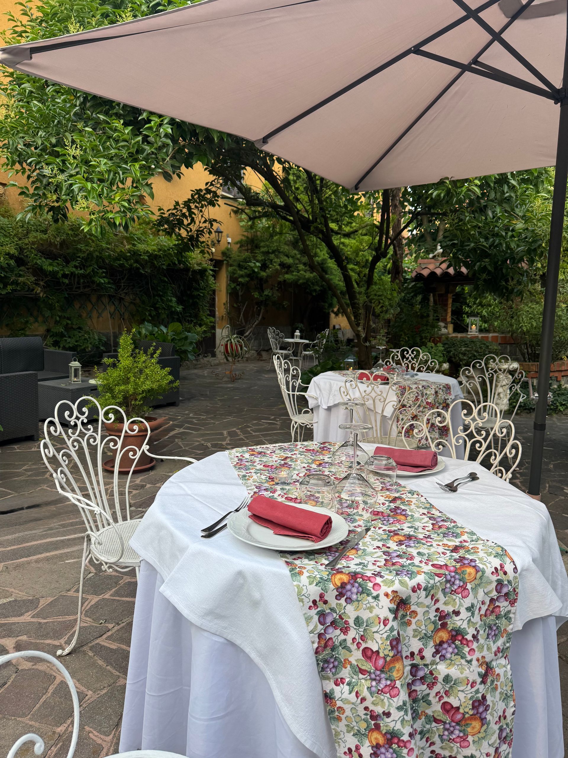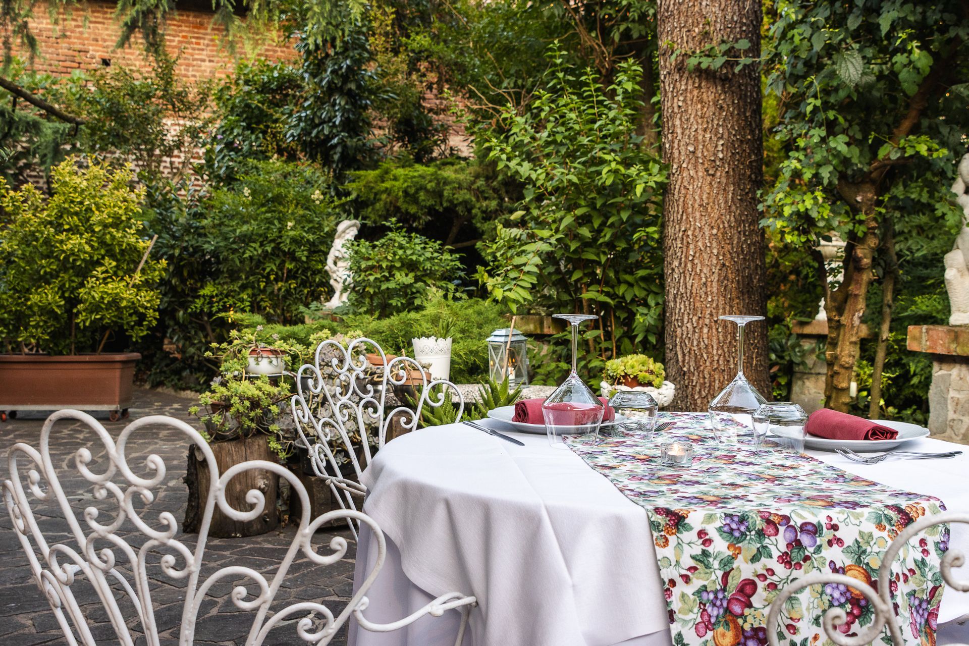 Dal periodo di giugno fino a settembre solitamente apriamo il nostro giardino immerso nel verde con due zone principali, la piazzetta per tavoli tondi più romantici e il bersò per cenare ‘sotto milioni di stelle’.