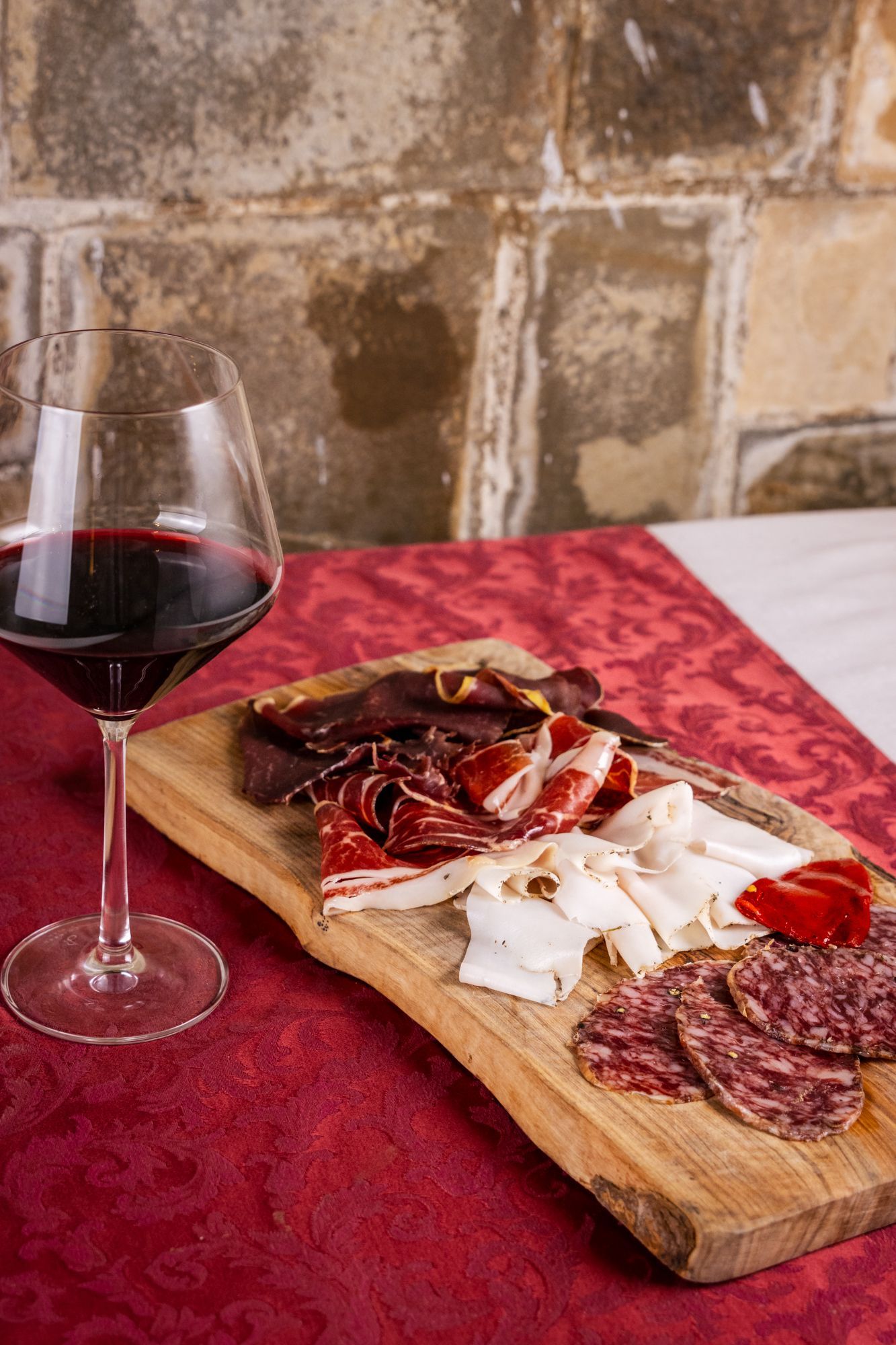 La nostra selezione spazia dai grandi classici italiani – come il Prosciutto crudo di Parma, la Coppa, la Pancetta e il Petto d’oca – fino a specialità iberiche di grande pregio, come il Pata Negra, la Cecina (bresaola di bovino iberico stagionata), il Lardo e il Salame iberico. Per chi ama i formaggi, proponiamo un percorso che va dai pecorini toscani ai formaggi erborinati lombardi, passando per una selezione francese impreziosita da gelatine di vino in abbinamento. Un antipasto che può essere elegante, ricco o conviviale, a seconda di come vorrete viverlo.